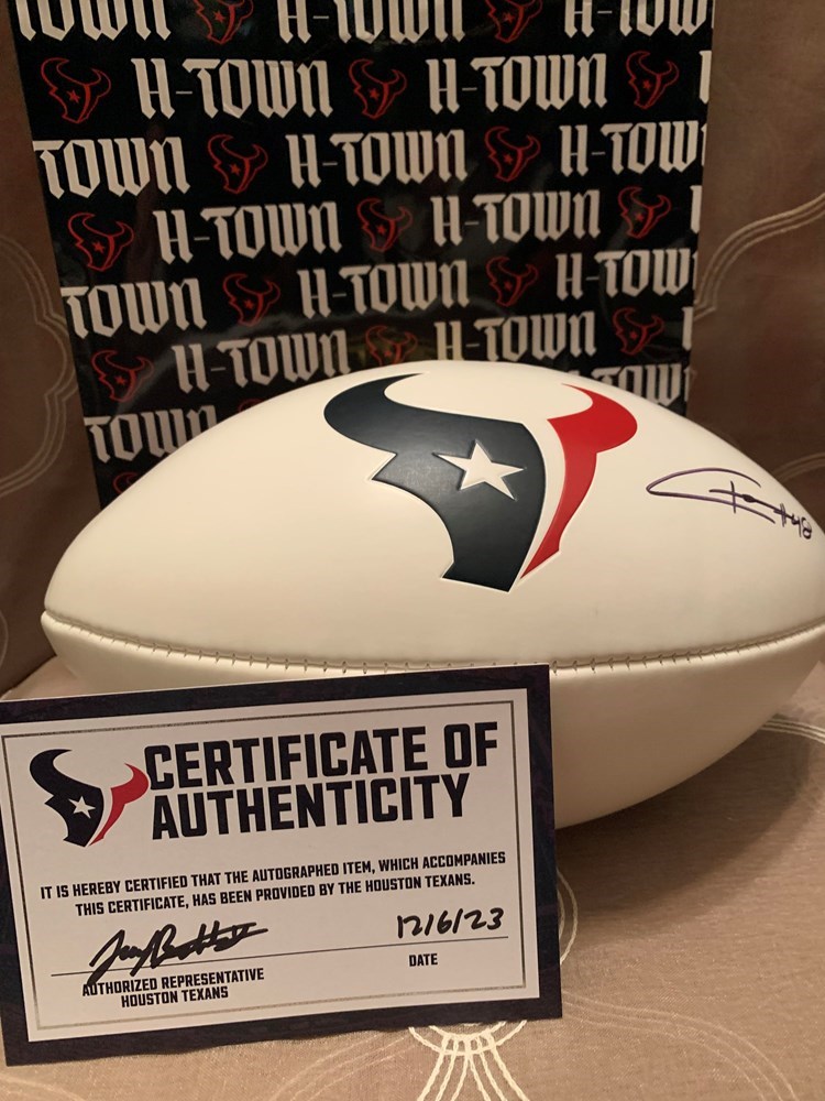 Football fans, this is your chance to own an autographed football. signed by Christian Harris, linebacker for the Houston Texans, of the National Football League (NFL). The football comes with a certificate of authenticity and statement of value from the Houston Texans Foundation.