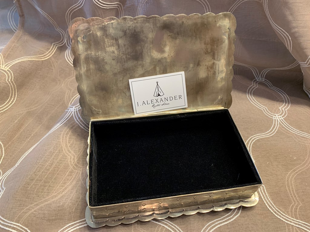 The J. Alexander Rustic Silver Stamped Rectangular Concho Box with Turquoise, a stunning addition to any home decor. Drawing inspiration from the craftsmanship of Navajo silversmiths from the late 19th and early 20th centuries, each J. Alexander Silver artisan-crafted box is a true work of art. This hand-tooled treasure box is infused with Southwestern style and showcases a unique vintage finish, exuding an air of authenticity and timeless charm. Lined with luxurious velvet and featuring a genuine turquoise stone centerpiece, handpicked for its exceptional quality, this versatile catch-all is perfect for safeguarding your cherished keepsakes. Dimensions: 8 × 5 × 2.5 in This item is available to Gala attendees only, No shipping available.