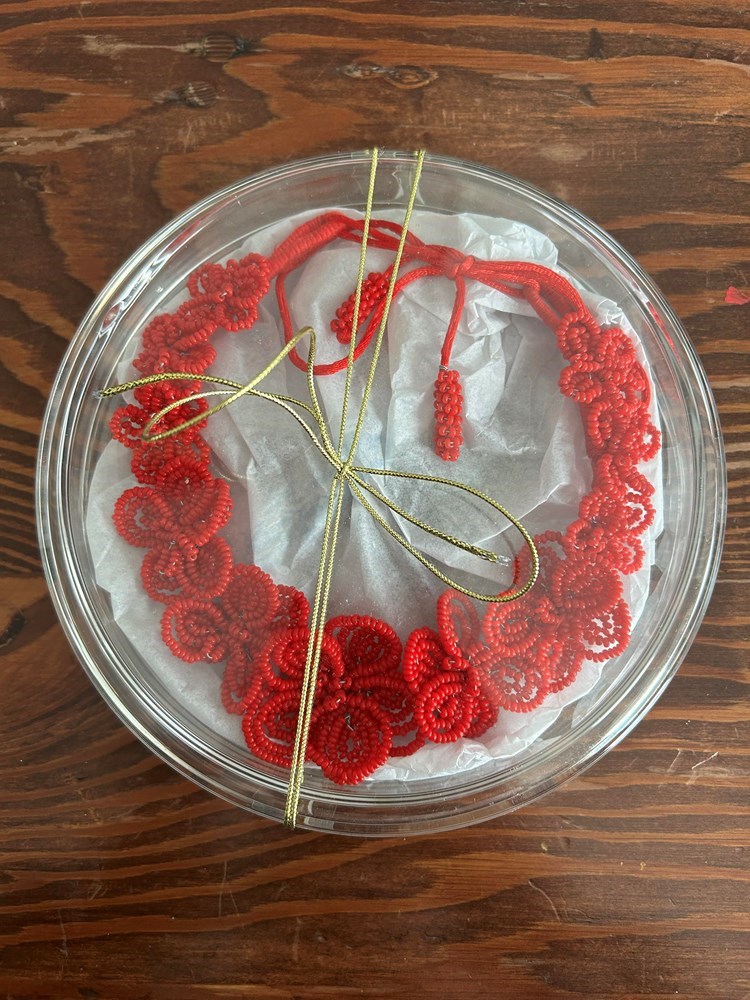 Necklace with beautiful floral beadwork from Venice, Italy in glass container.