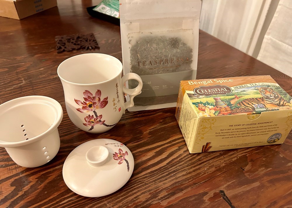 Teapressa pouch of tea Celestial Seasonings Tea Ceramic tea mug