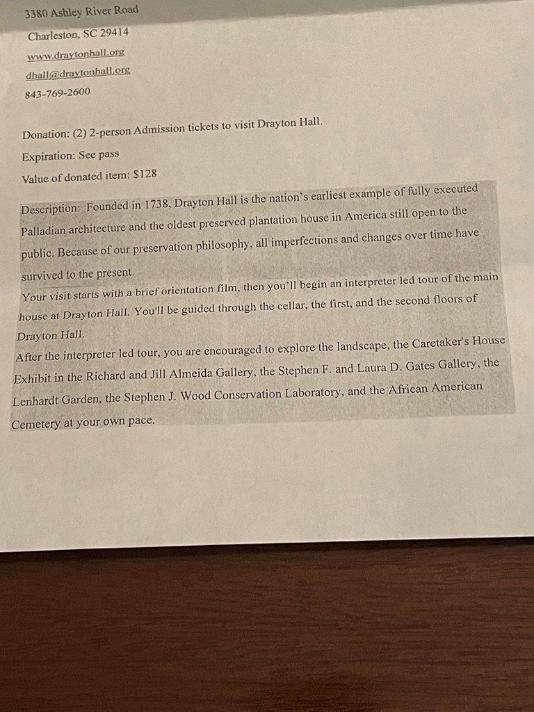 Drayton Hall, Two Sets of Passes for Two People Each.