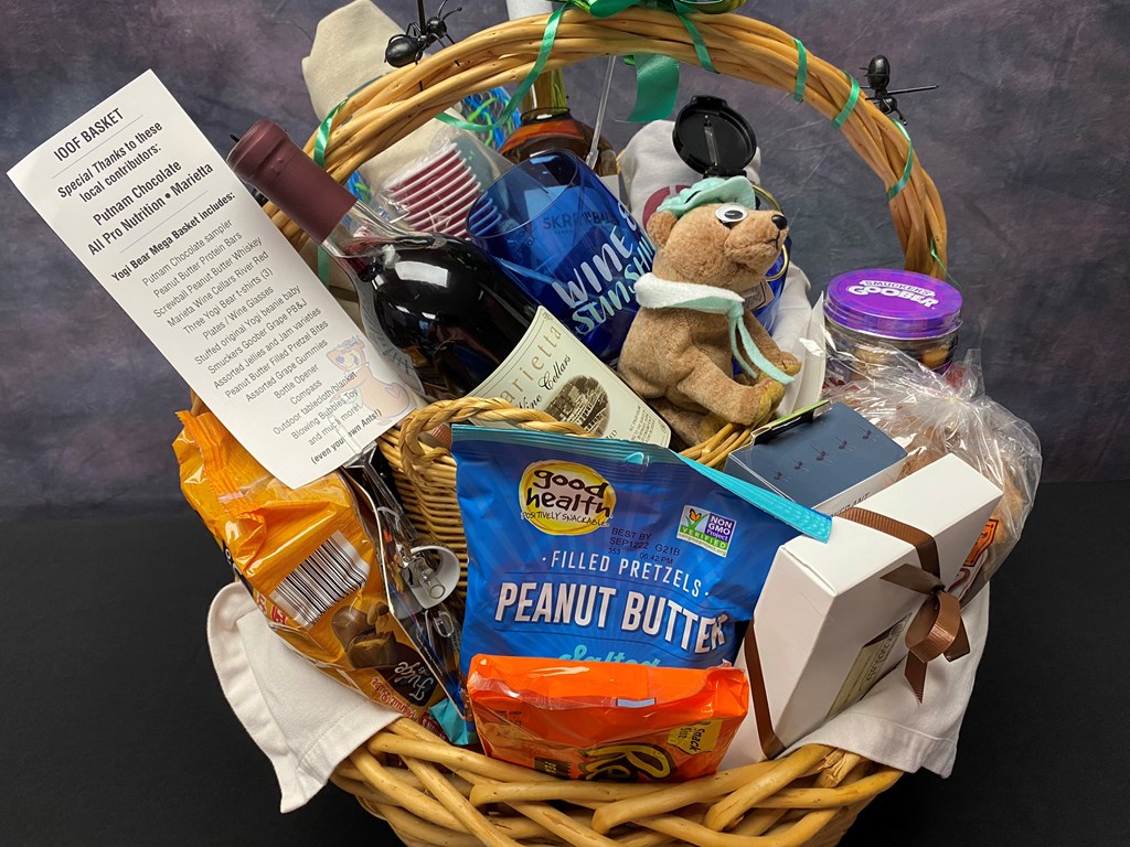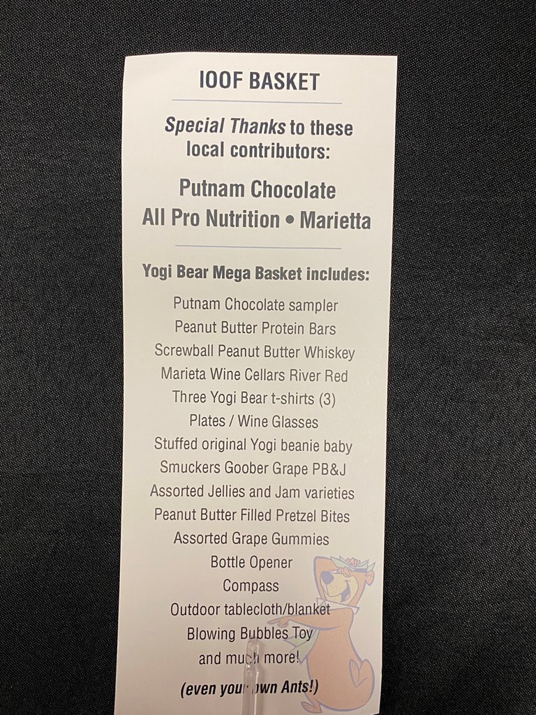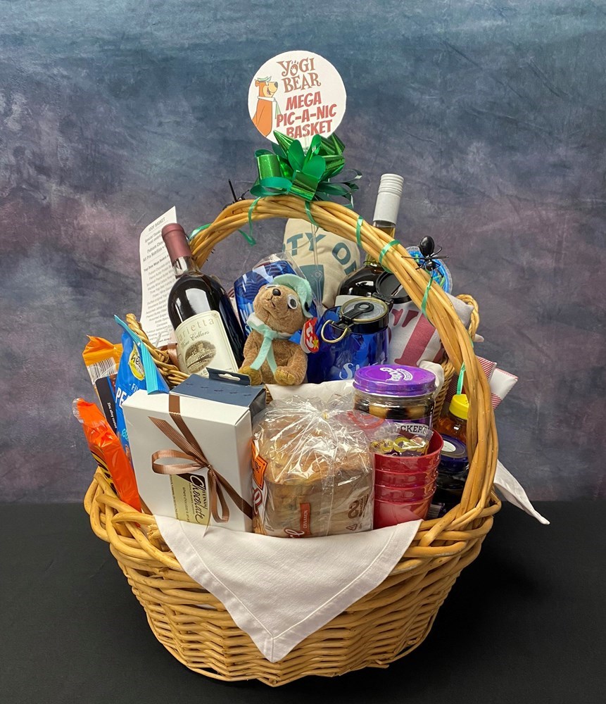 It's a good thing Yogi has bear strength, because this picnic basket is heavy! It's filled to the brim with everything needed for an amazing picnic with Yogi and Booboo - lots of peanut butter and jelly goodness. Actually, it's not one basket, but two!!! There are goodies tucked in everywhere. The Odd Fellows thought of everything, even the ants!!! Valued at over $300, here's the run down: Putnam Chocolate Sampler Peanut Butter Protein Bars Screwball Peanut Butter Whiskey Marietta Wine Cellars River Re Three Yogi Bear Adult T-shirts (see photos for designs) Plates & Wine Glasses Stuffed original Yogi Beanie Baby Smuckers Goober Grape PB & J Assorted Jellies and Jam Varieties Peanut Butter Filled Pretzel Bites Assorted Grape Gummies Bottle Opener Compass Outdoor Tablecloth/Blanket Blowing Bubbles Toy Ant Appetizer Picks