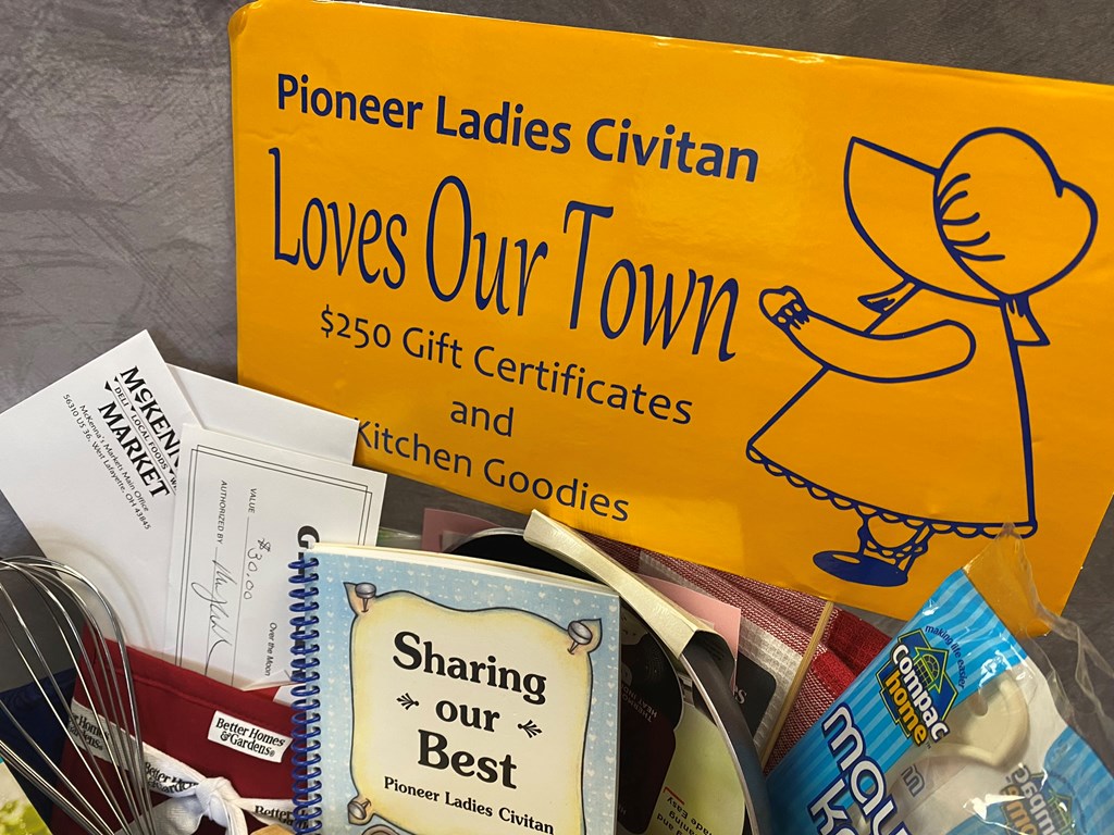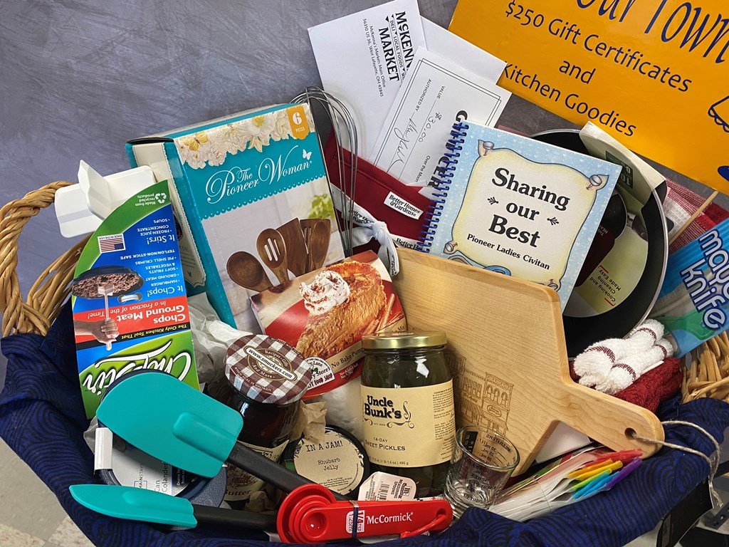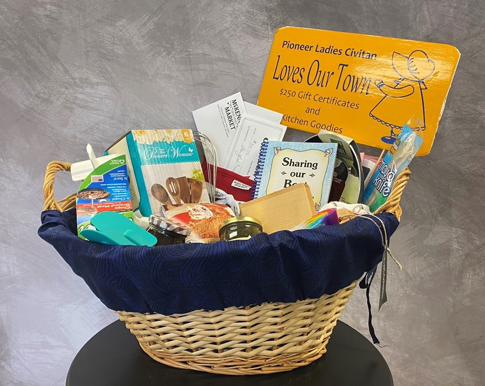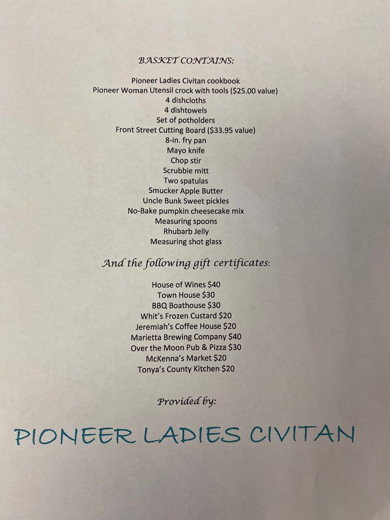 The Pioneer Ladies Civitan Club Loves Our Town, and it is apparent in this fantastic basket they put together that features kitchen goodies and $250 in gift certificates! The basket, valued at over $400 includes: Pioneer Ladies Civitan Cookbook Pioneer Woman Utensil Crock with Tools 4 Dishcloths 4 Dishtowels Set of Potholders Front Street Cutting Board 8 inch Frying Pan Mayo knife Chop Stir Scrubbie Mitt Two Spatulas Smucker Apple Butter Uncle Bunk Sweet Pickles No-Bake Pumpkin Cheesecake Mix Measuring Spoons Rhubarb Jelly Measuring Shot Glass and the following Gift Certificates: $40 @ House of Wines $30 @ Town House $30 @ BBQ Boathouse $20 @ Whit's Frozen Custard $40 @ Marietta Brewing Company $30 @ Over the Moon Pub & Pizza $20 @ McKenna's Market $20 @ Tonya's Country Kitchen