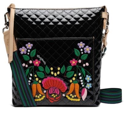 Iconic floral embroidery on black quilted exterior Front slip pocket and secret side zip pocket Interior pockets Zip top closure 10 ¼” (Base Width) x 11 ½” (H) x 1 ½” (D) 15 ¼”- 28 ½” adjustable crossbody strap drop Donated by Clint and Stacey Humphreys at Ride Solutions Inc.