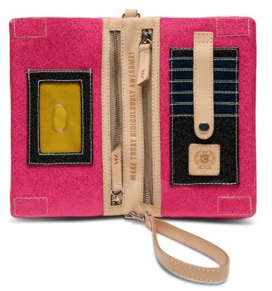 Iconic floral embroidery on Ivy hot pink glitter exterior Double magnetic closure Two interior zipper compartments Exterior zipper compartment Six card slots ID window Included detachable wristlet strap and adjustable woven crossbody strap Trimmed in natural, untreated leather 8 ½” (L) x 5” (H) x 1 ½” (D), 16 ½”-29” adjustable crossbody strap drop Donated by Clint and Stacey Humphreys of Ride Solutions Inc.