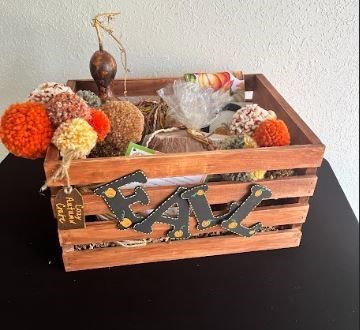 What's Inside This Autumn Crate Within this crate of autumn cheer, Are handmade treasures gathered here: A pom-pom garland strung with beads, A candle with scent your spirit needs. A pumpkin print, watercolor bright, A gourd hand-stained for rustic delight. A pound cake recipe, time-honored and sweet With nuts spiced warmly - a seasonal treat. A pumpkin painted, a towel for tea, Simple comforts for you to see. Bid with joy and take home the fate