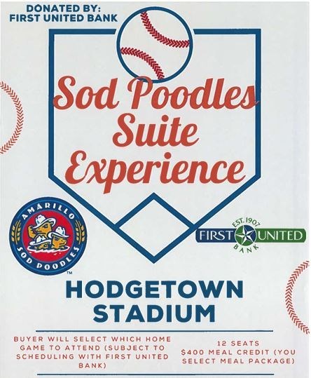 Donated by: First United Bank Sod Poodles Suite Experience -Hodgetown Stadium -Buyer will select which home game to attend (*subject to scheduling with First United Bank) -12 seats -$400 Meal Credit (you select the meal package)