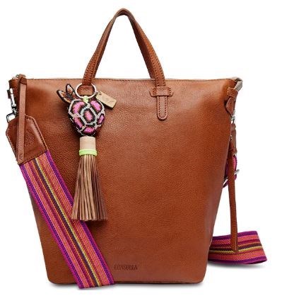 Brandy cognac leather exterior Includes Brandy charm Zipper closure Interior slide pocket, zipper pocket, credit card slots, and hook-clip lanyard Exterior side zip pocket Includes two detachable straps: a leather shoulder strap and an adjustable woven crossbody strap Brandy leather handles and trim 10 ¼” (W at the base), 14 ½” (W at the top) x 13” (H) x 6 ¾” (D), 13”-22 ¾” adjustable crossbody strap drop Donated by: The Sassy Sip & Kylee K Photography (Kylee Kerby)