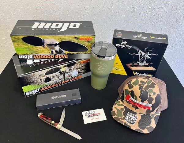 (2) MOJO® Voodoo Dove—spinning-wing dove decoy for hunters. ($80 value) BOKER Traditional Series 2.0 Trapper, CPM-D2 Dual Blades, Slip Joint, Made in Solingen Germany ($55 value) Warthog V-Sharp A4 Knife Sharpener, Professional Sharpener, Ideal for Home Cooks, Chefs, Fishermen, Hunters, 325 Grit Diamond Rods with Adjustable Angles, Metal Frame Construction ($125 value) ZBar Tumbler SS Outfitters Hat $250 SS Outfitters Gift Card Donated by Zack Jones at Z Bar Supply
