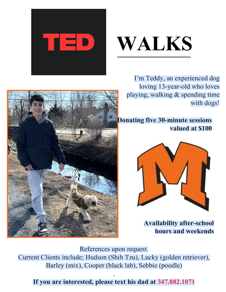 Ted-Walks. Dog walking services. Donating five 30-minute sessions valued at $100 I’m Teddy, an experienced dog loving 13-year-old who loves playing, walking & spending time with dogs! References upon request. Current Clients include; Hudson (Shih Tzu), Lucky (golden retriever), Barley (mix), Cooper (black lab), Sebbie (poodle) If you are interested, please text his dad at 347.882.1071. Availability after-school hours and weekends
